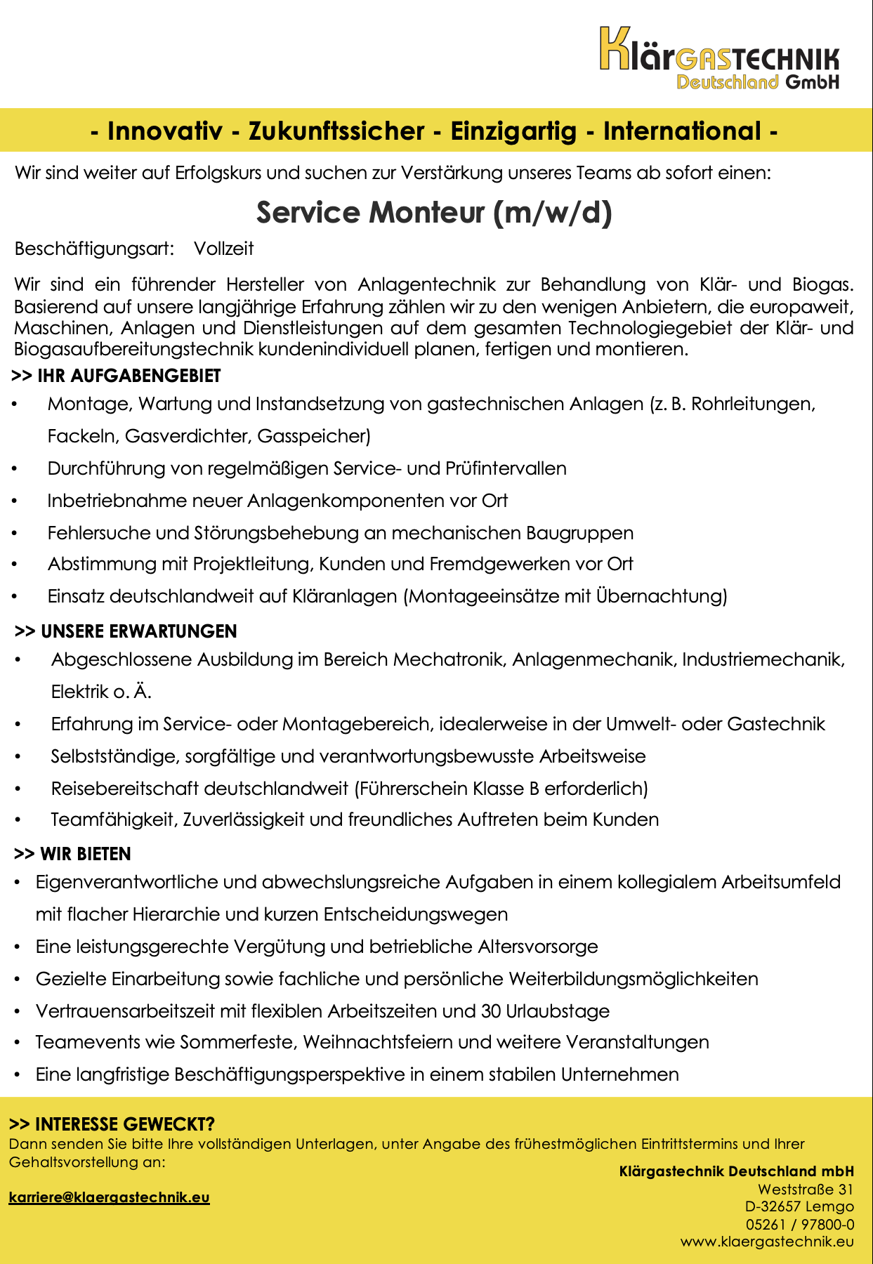 KARRIERE BEI KLÄRGASTECHNIK DEUTSCHLAND GMBH